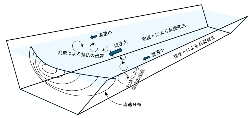 開水路の流れでは、底面や側壁の粗度によってせん断応力と乱流が発生し、その影響は断面内の一部にとどまらず、運動量輸送を通じて流路断面全体に及びます。