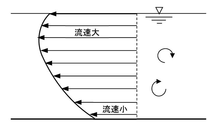 上図のように壁面(底面)近傍では乱流の影響が強く、断面の中央に向かって影響が弱まるため中央部の流速が最も大きくなります。
